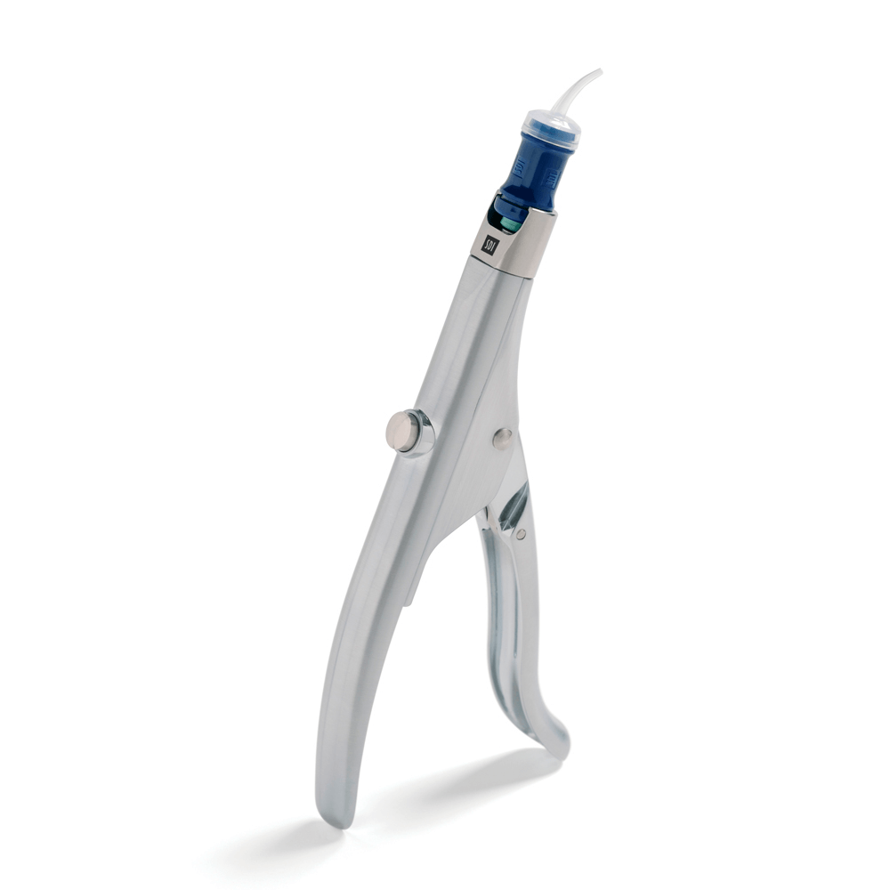 Características • Ergonômico. • Design sofisticado. • Fácil de limpar – autoclavável. • Proporciona fácil acesso a cavidade oral. • Possui uma trava para a cápsula que controla a extrusão de material. • Partes mecânicas em aço inox.