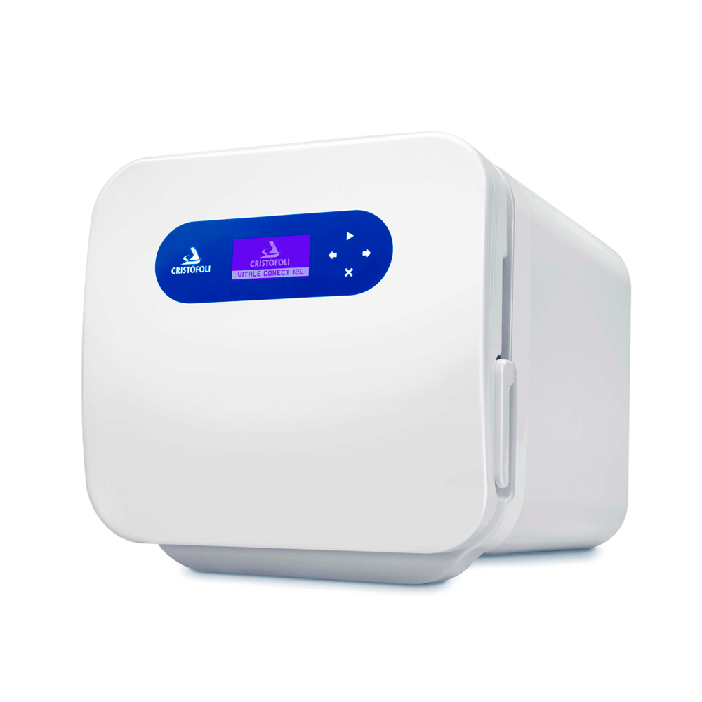 Autoclave Vitale Conect 12L Cristófoli, Classe S, desenvolvida para esterilização de artigos e instrumentos termorresistentes embalados e desembalados utilizando vapor saturado sob pressão.