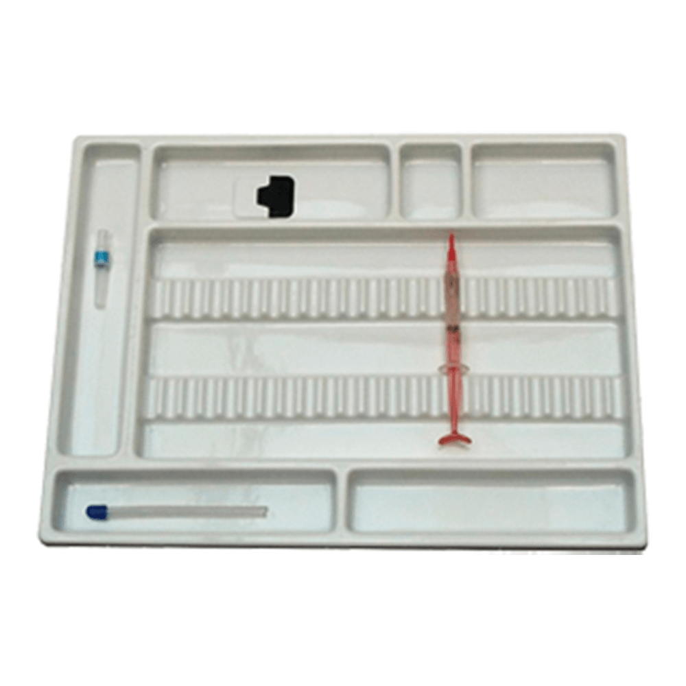 Gaveta odontológica com 24 divisões para instrumentos de mão e outros 6 nichos para itens diversos, feita em poliestireno de alta resistência, medindo 30x40cm, disponível na cor branca com acabamento em alto brilho. Prática e fácil de limpar. Feito com dupla laminação, o que aumenta a resistência a materiais corrosivos.