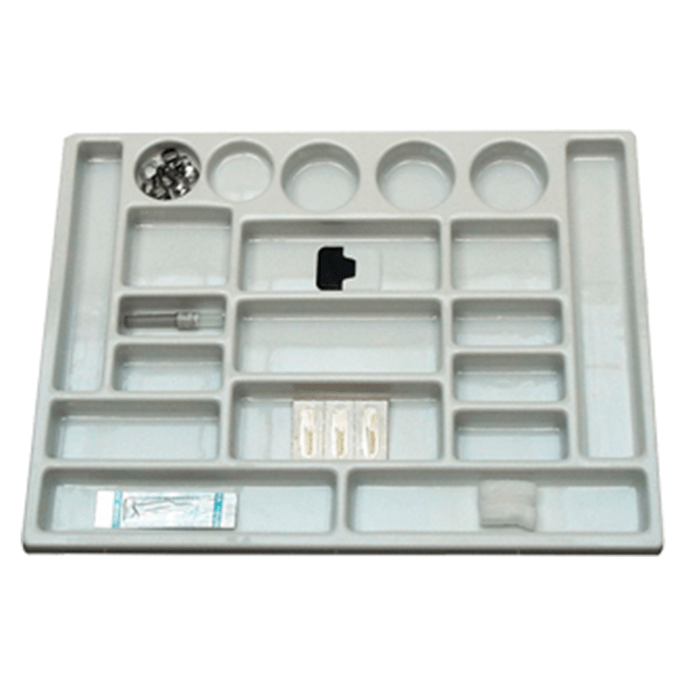 Gaveta odontológica multi-uso, de plástico de alta resistência, medindo 40x30cm, disponível na cor branca. Prática e fácil de limpar. Possui 20 nichos, retangulares e circulares, ideal para organizar vários itens. Feita com dupla laminação, o que aumenta a resistência a materiais corrosivos.