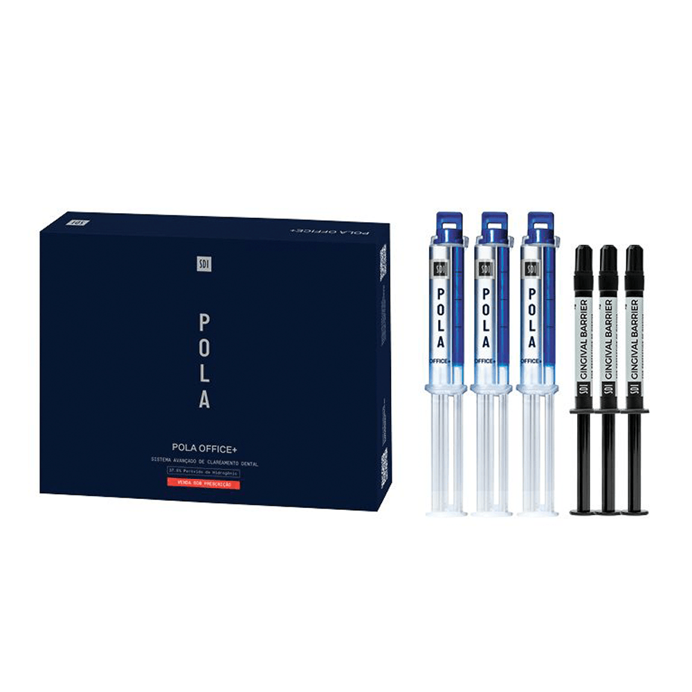 Peróxido de Hidrogênio 37,5%. Kit com 3 unidades de Pola Office, 2,8ml cada + 3 de Barreira Gengival, 1g cada + 3 Afastadores de bochecha Optragate + Acessórios.