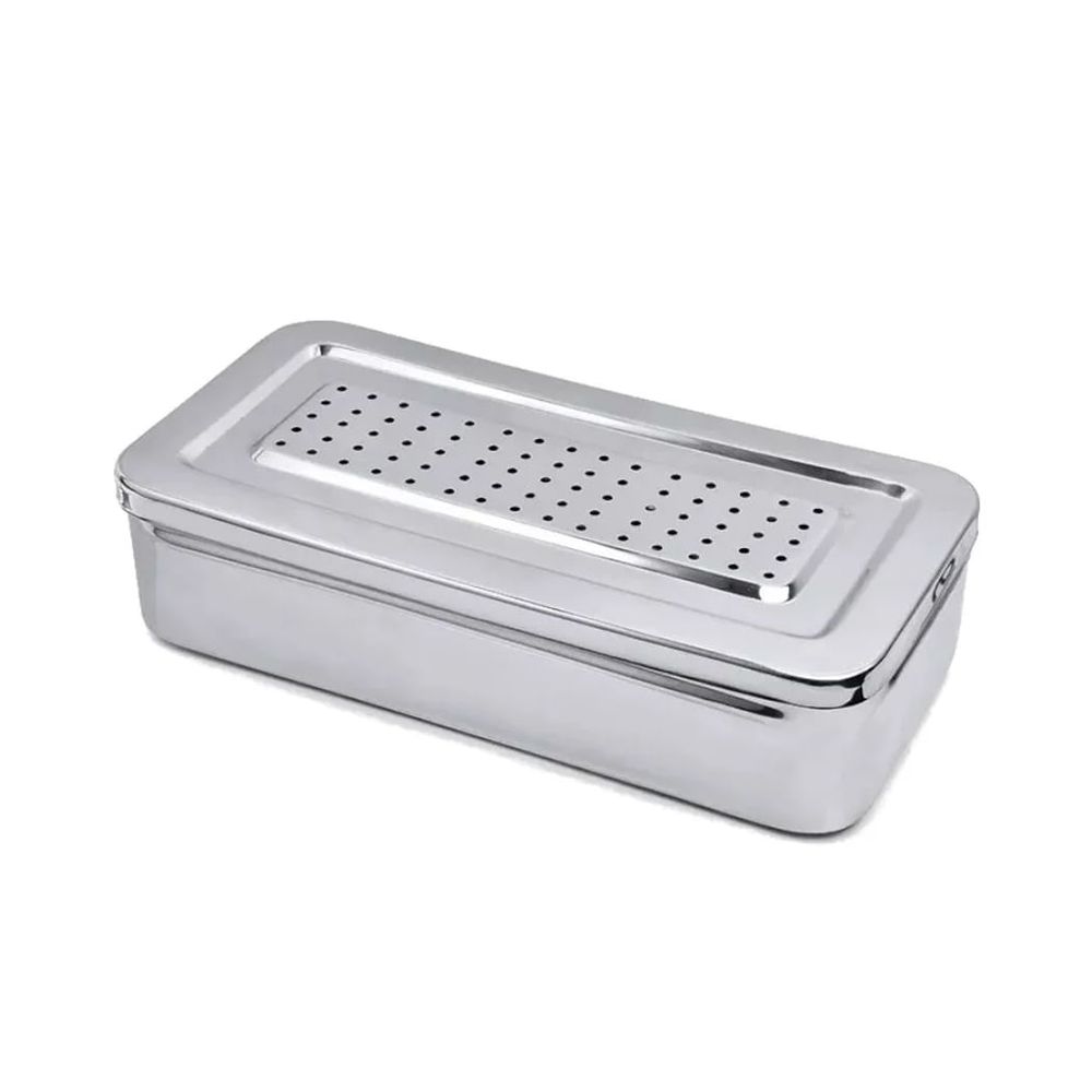 O Estojo Inox Perfurado 18x8x3cm Golgran é ideal para acondicionar e levar instrumentais odontológicos à autoclave para esterilização.