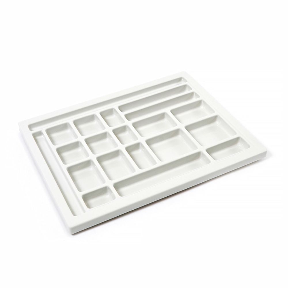 Possui 12 divisões para instrumentos de mão curtos; 12 divisões para instrumentos de mão longos; e 5 divisões retangulares. Medidas 40,5 x 30,5 x 2,5cm, branco.