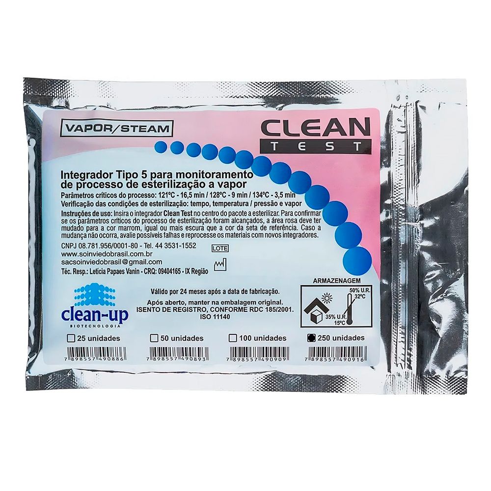 O Clean Test é um Indicador Integrador Químico de Classe 5, o mais alto nível de controle de qualidade para a monitorização do processo de esterilização. O produto é altamente confiável e fácil de usar, com resultados rápidos e precisos. Além disso, com 250 unidades por embalagem, você terá uma excelente relação custo-benefício.