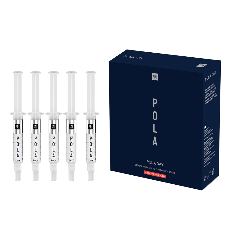 Aparência cristalina com uma mistura única de dessensibilizante, condicionadores e água que reduzem ao máximo a sensibilidade. Sabor de menta durável e refrescante. Composição: Pola Day: 3.0-9.5% Peróxido de hidrogênio, < 47% aditivos, 30% glicerol, 20% água, 0.1% aromatizantes.
